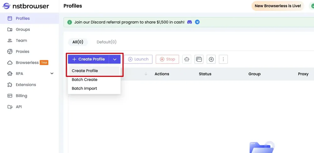 在主界面点击"Create Profile"创建新的浏览器环境。每个环境可以配置独立的指纹和代理设置,便于多账号管理。