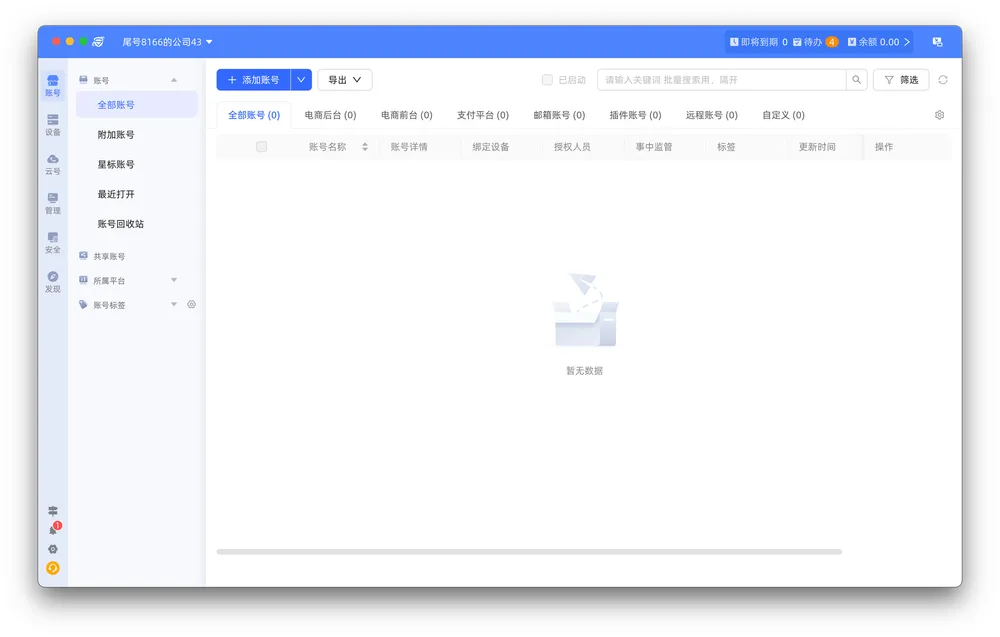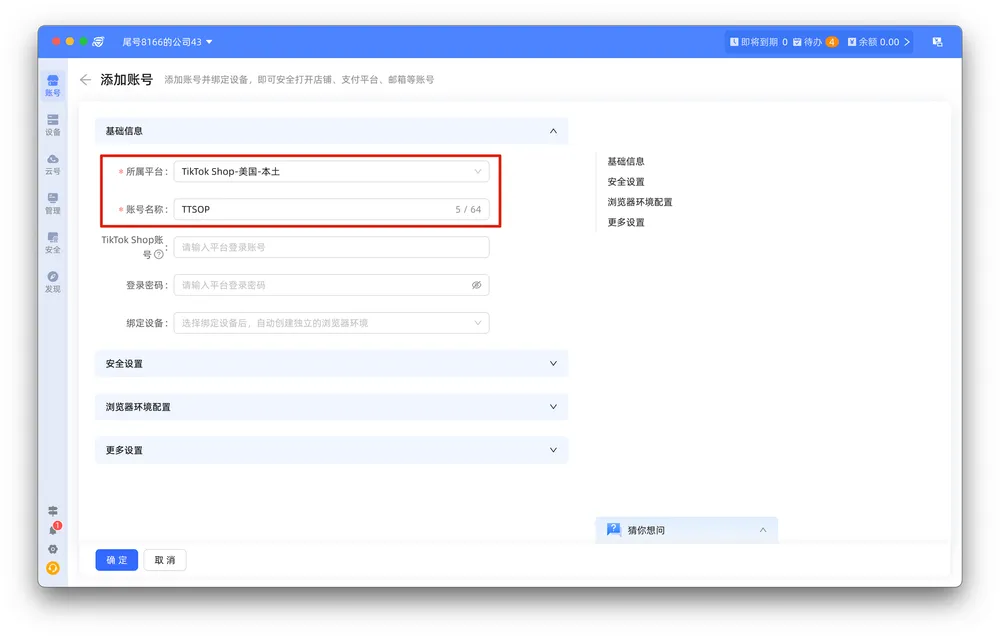 在紫鸟浏览器界面中,点击"账号",选择添加账号。这时会弹出一个窗口填写账号信息,其他信息根据需要可选填写。完成后点击“确定”