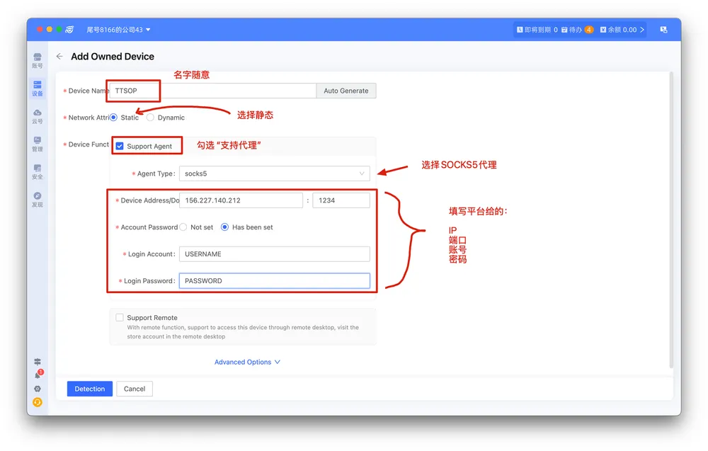 填写必要的代理信息,完成后点击最下面“检测”按钮,完成添加。