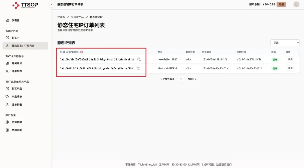 登录TTSOP平台,在"我的IP"页面中找到您购买的静态住宅IP信息,包括IP地址、端口号、用户名和密码。