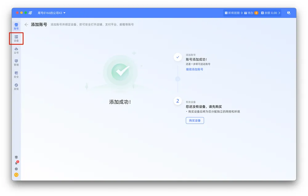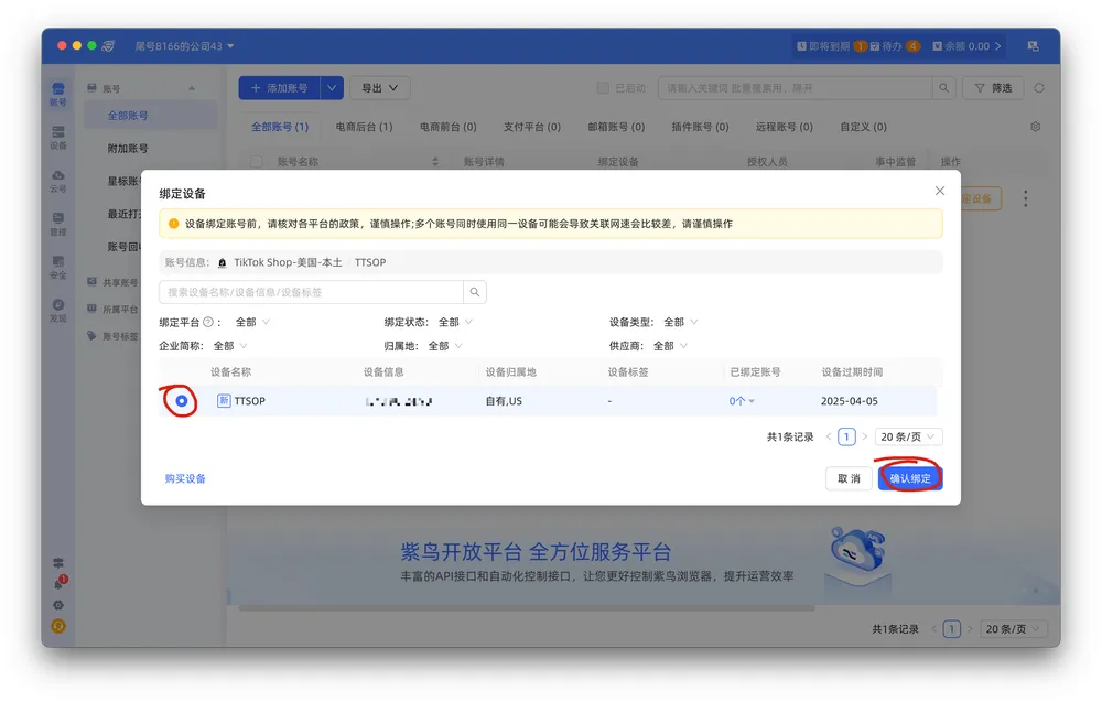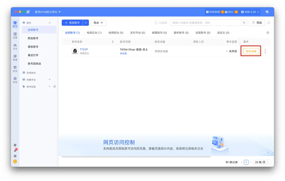 回到“账号”选项卡,选择刚才配置的账号旁边的“绑定设备”。